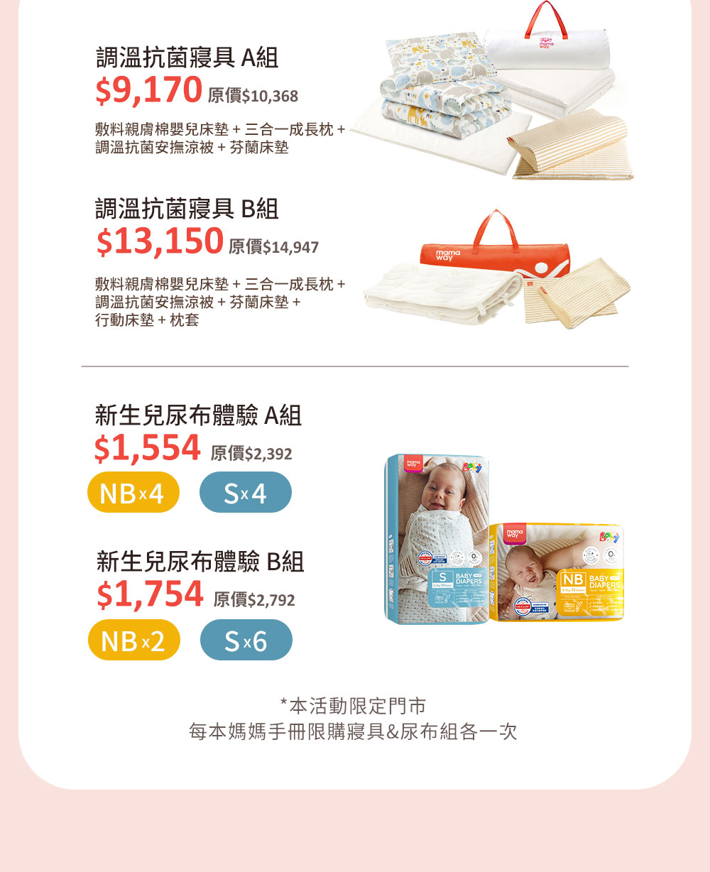 - 寢具組方案二擇一,限定實體門市,每本媽媽手冊限購一次